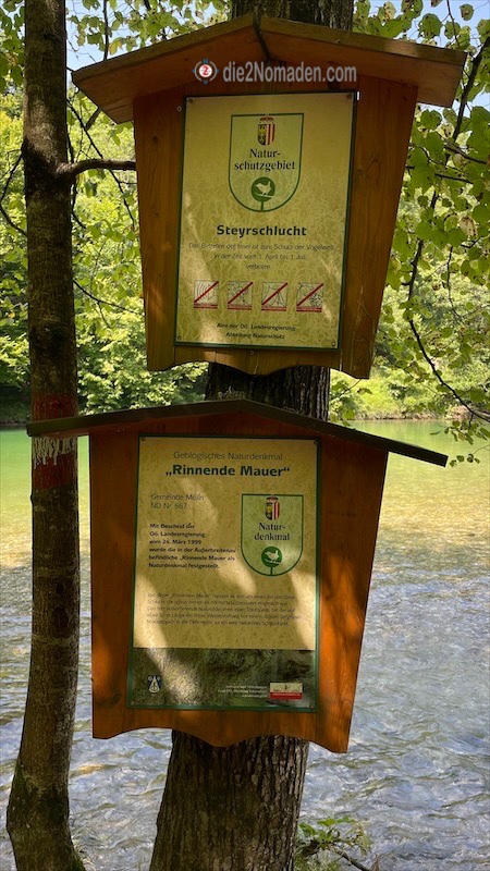 MOLLN. Eine kurze, wenn möglich schattige Wanderung – und schon fällt unser Blick auf die Rinnende Mauer, die schon seit längerem auf unserer Liste steht, die aber von meinem Wanderguide André immer wieder aufgrund von Einfachheit, Kürze und zu wenigen Höhenmetern verworfen wurde. Aber heute passt diese Wanderung perfekt, da bei über 30 Grad mit mir nicht viel anzufangen ist – zumindest nicht wandertechnisch – Eis essen gehen ist okay. Und so packen wir unsere sieben Sachen und starten erst einmal nach Micheldorf. Nach diesem Zwischenstopp geht es weiter nach Molln, wo wir am Parkplatz Stefaniebrücke noch den letzten Platz für unser Auto ergattern und marschieren los.