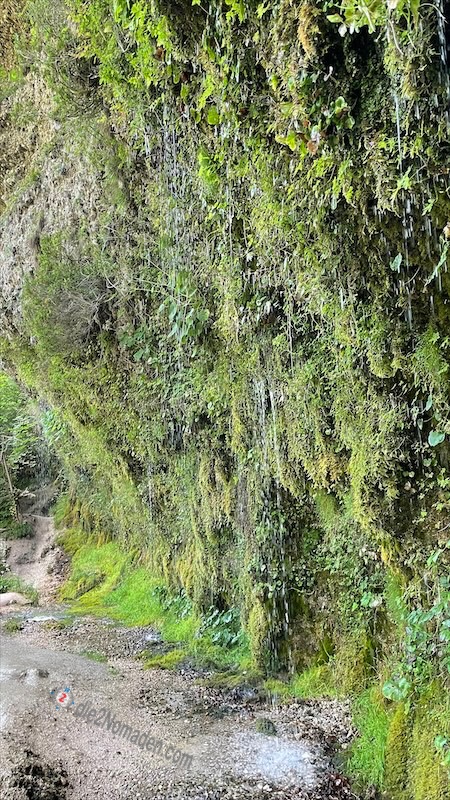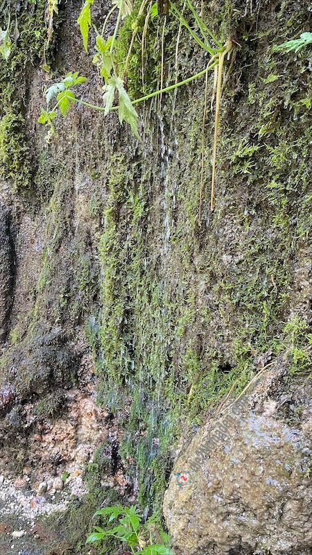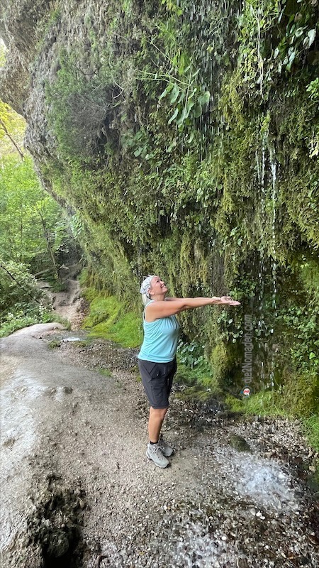 Und dann stehen wir vor der Rinnenden Mauer, die unter Naturschutz steht. Etwa 50 Meter lang und fünf bis sieben Meter über der Steyr tritt Grund- und Hangwasser in Form von Sprühregen und größeren Tropfen aus und kühlt natürlich wunderbar nach unserer heißen Wanderung. Wir treten so nahe wie möglich an die Wand und halten unsere Arme unter das kühle, erfrischende Nass. Herrlich ist die grüne Wand anzusehen, so überwuchert mit Moos und Pflanzen.
