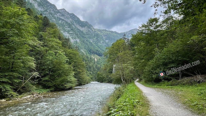 Nochmals wird der Bach gequert, dann geht es etwa 30 min. am linken Ufer entlang Richtung Obertraun.