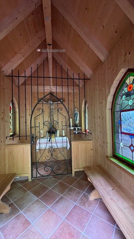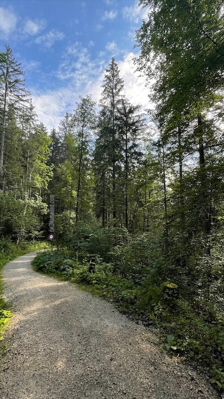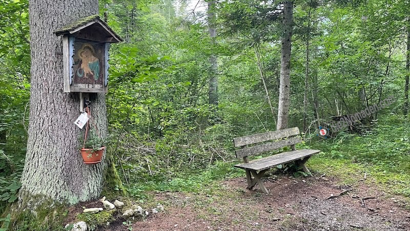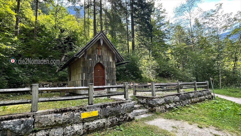 Hier bei der Kapelle, nach etwa 10 km, lege ich meine erste Rast ein und genieße die Geräusche der Natur. Das Rauschen des Baches, der Blätter und das Zwitschern der Vögel wirkt unglaublich beruhigend. Es ist kurz nach 10 Uhr und mein Körper freut sich über eine kleine Stärkung.