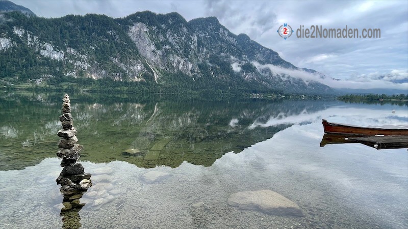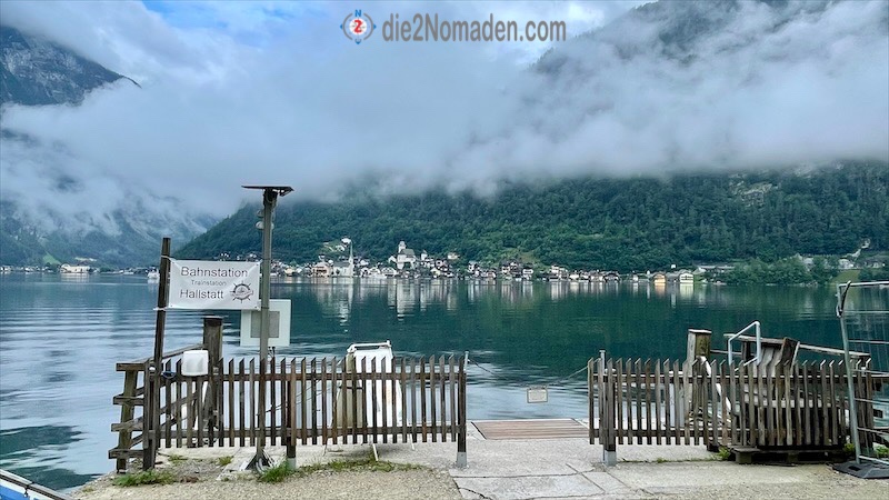 Noch eine kurze Info an meine bessere Hälfte zu Hause, den schweren Jack (Wolfskin) geschultert und los geht es Richtung Bootsanlegestelle. Ab hier zieht sich der Weg immer die Bahntrasse entlang, bis ich die Haltestelle Hallstatt erreiche. Ankommende Gäste werden am Ufer abgeholt und quer über den See nach Hallstatt verfrachtet.