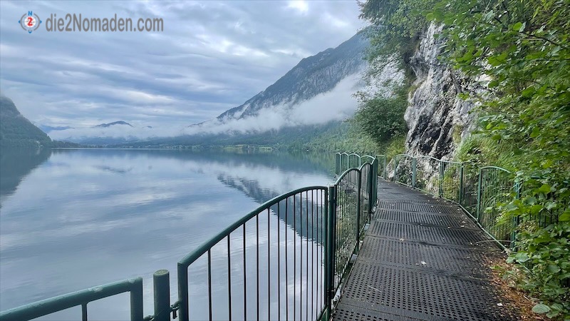 Leider will die Sonne nicht raus und so muss ein wolkenbehangenes Foto auch genügen. Weiter entlang der Bahnstrecke wurde der Weg mittels einer Stahlkonstruktion über dem See in den Felsen verankert. Eingepasste Gummimatten verhindern ein immerwährendes Klappern beim Befahren bzw. Betreten.