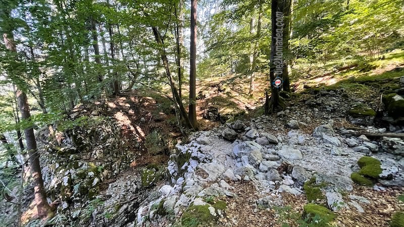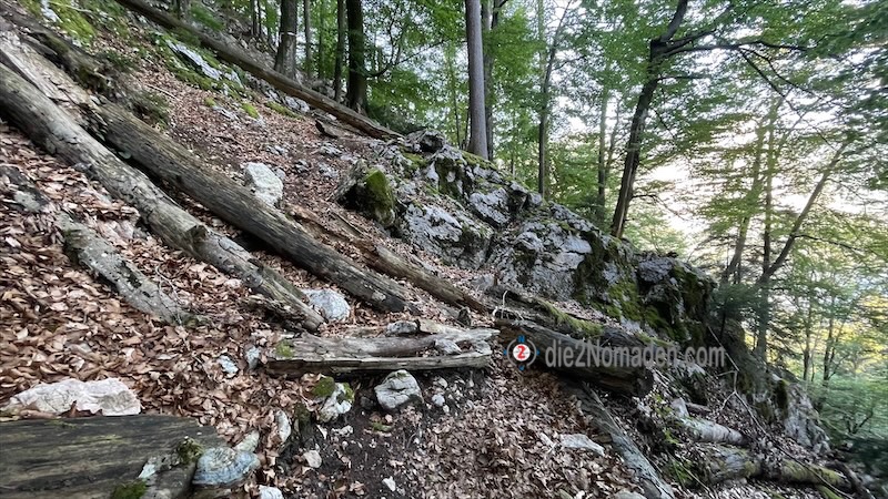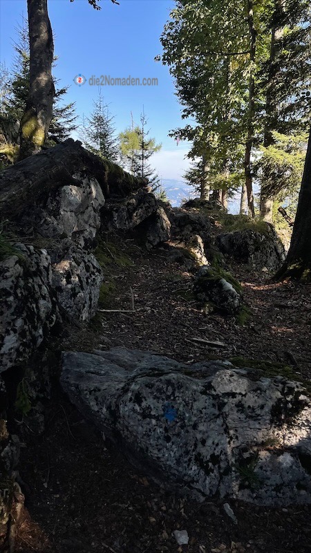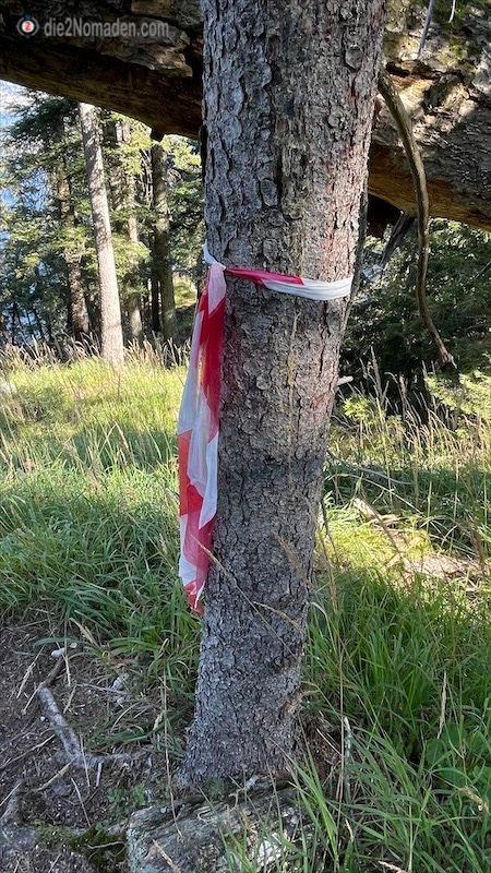Nachdem ich den unmarkierten Weg gefunden habe, geht es wieder zügig voran. Schön ausgetreten und mit Absperrbändchen an Bäumen gekennzeichnet (sind noch vom Traunsee-Marathon vorhanden) ist der Weg hier wieder leicht zu finden. Ab und zu kommen mir sehr sportliche Wanderer entgegen und warnen mich betreffend Abstieg am Daxnersteig vor.