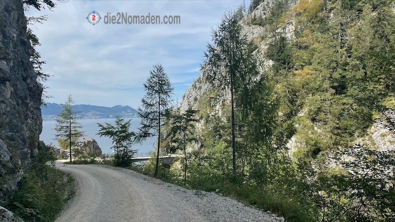 Ich nehme einen kleinen, unscheinbaren Ein-/Abstieg links vor der Brücke und gehe den Miesweg zurück, nicht ohne einmal kurz die Füße im kühlen Traunsee zu baden.