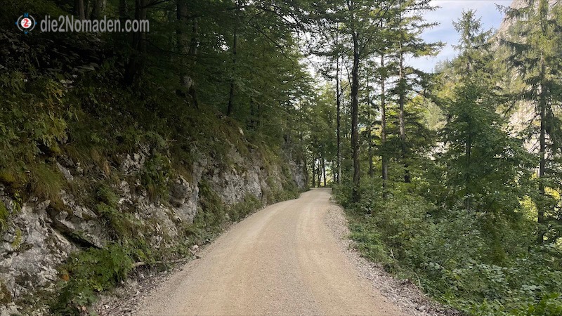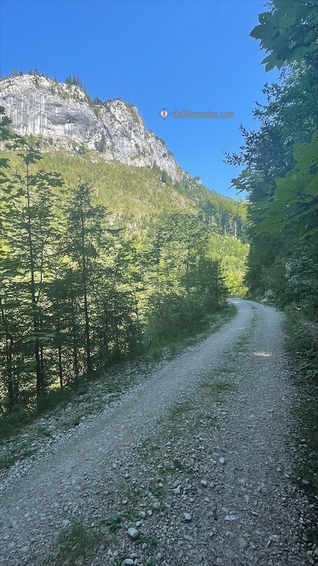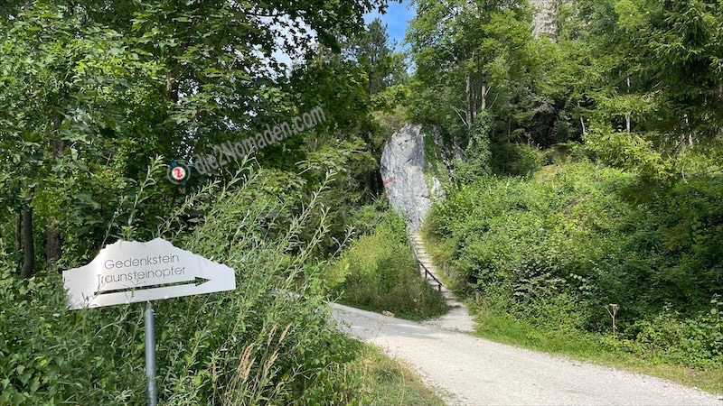 Nun folge ich der Schotterstraße bis zum ersten Tunnel. Rechts, vor dem Tunnel, aber nach der Brücke ist der Einstieg des Naturfreundesteiges auf den Traunstein.