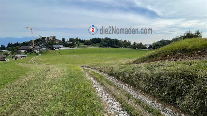 Anfangs geht es auf einer Straße hoch zur Burgruine Finkenstein, an der gerade gebaut wird, weiter zur Baumgartnerhöhe, die mir netterweise wenigstens einen Platz im Heustadl angeboten hätte, um anschließend den letzten Anstieg in Österreich in Angriff zu nehmen.