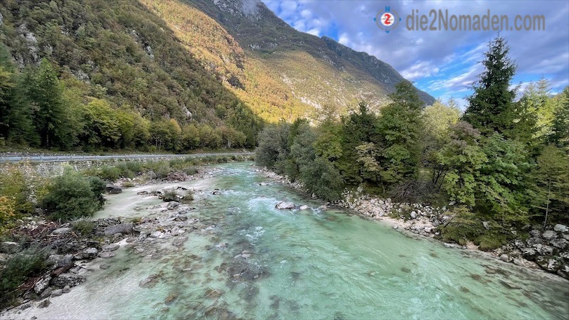 Die schöne, intensive, smaragdgrüne Farbe der Soca wird im Schein der Sonne nochmals verstärkt und gewinnt an Intensität.