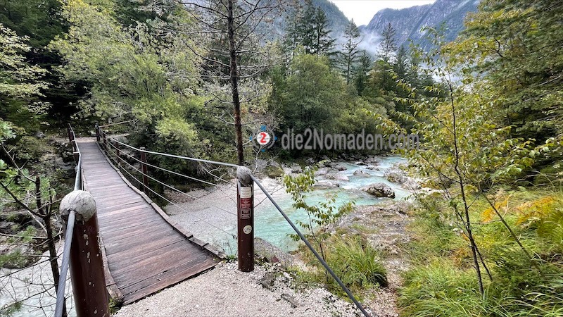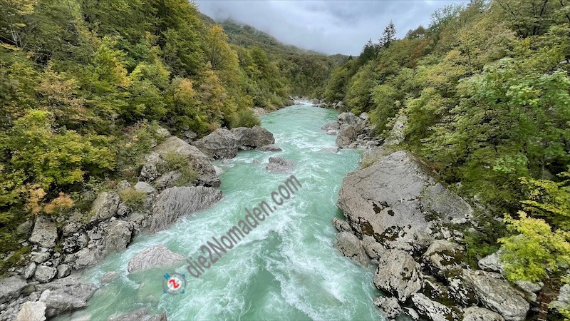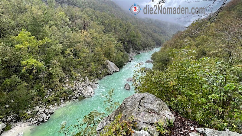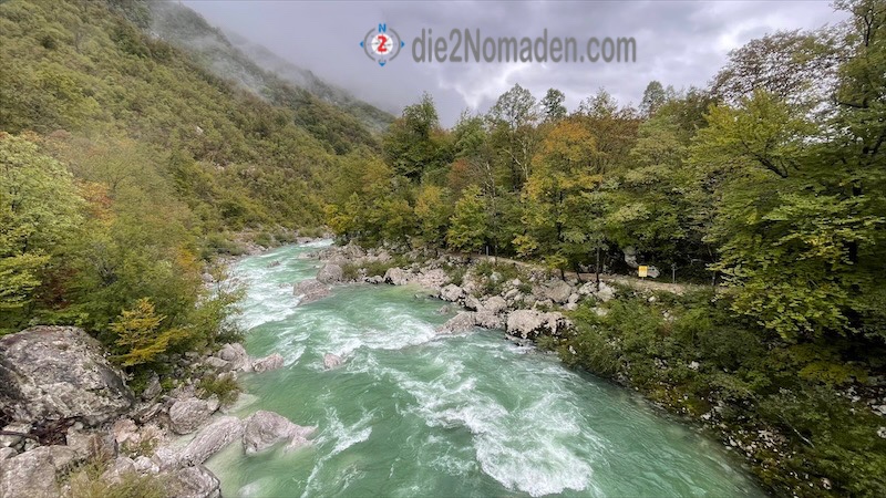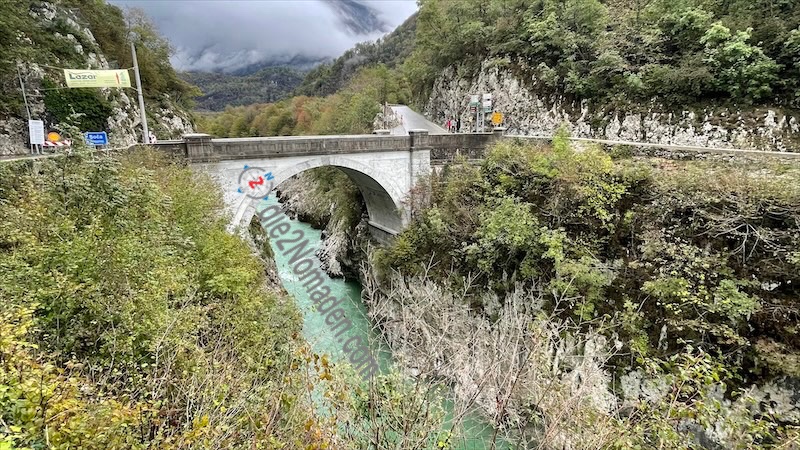 Nun geht es nur mehr der Soca entlang nach Kobarid. Die hohe Brücke vor dem Ort gilt als Wahrzeichen und man staunt nicht schlecht, wie tief hier die Soca sich schon eingeschnitten hat.