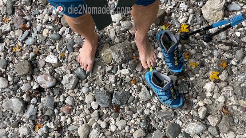 Also die seichteste Furt ausgewählt, Schuhe und Socken ausgezogen, alles so gut es geht verpackt und durch die Fluten gestapft.