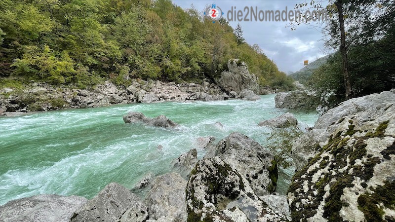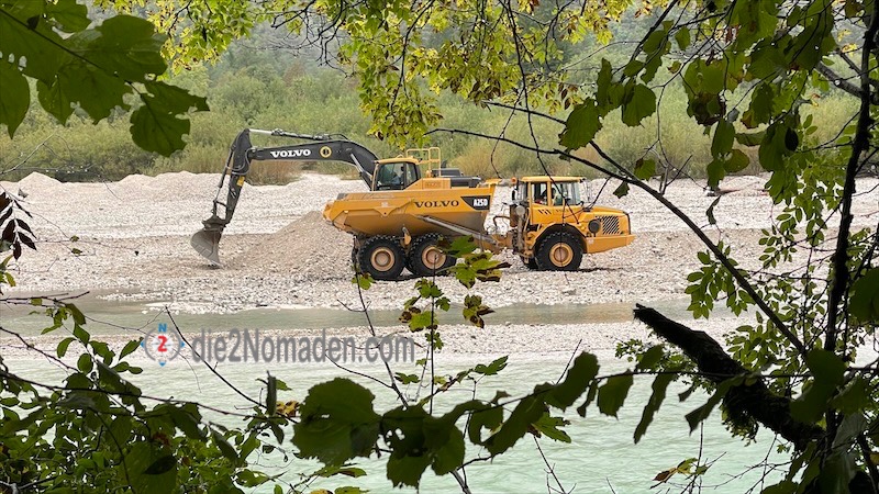 Die Soca wird von Kilometer zu Kilometer immer breiter und könnte teilweise der Donau konkurrenz machen. Die Versandung des Flussbeetes ist enorm und wird mittels Baugeräten ausgehoben.