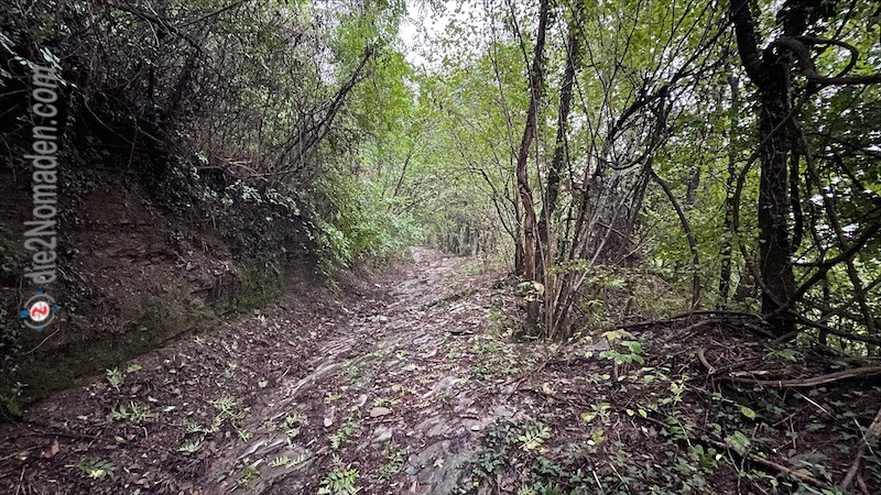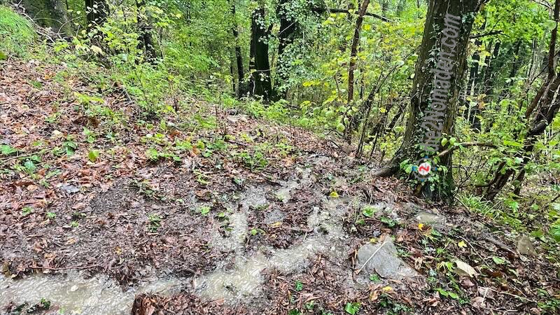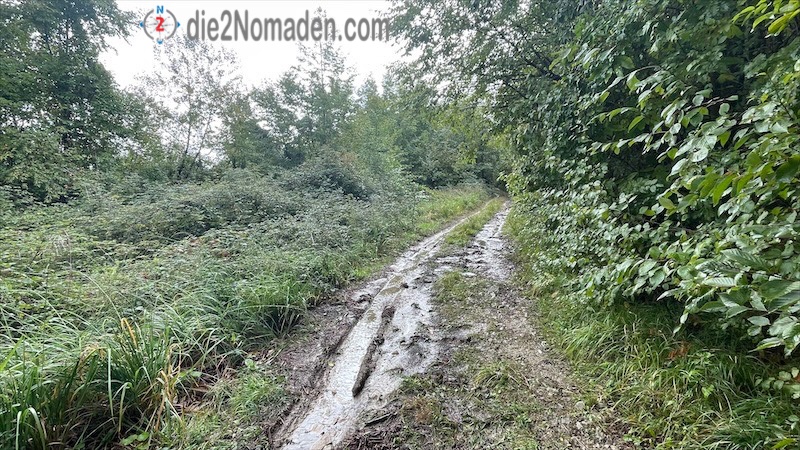 Also umkehren, GPS auspacken und anderen Weg suchen. Das Problem ist, der „Um-Weg“ ist erdig und mit Laub übersäht, mit Wasser getränkt wird es so richtig rutschig und auf die Äste und Krempen muss man ebenfalls aufpassen, damit die einem nicht den Poncho zerstechen.