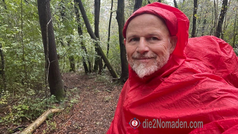 Komischerweise kommt das Geräusch mit hohem Tempo auf mich zu und ich schaffe es gerade noch, alle Luken meines Ponchos zu schließen, bevor der sintflutartige Wolkenbruch auf mich hernieder prasselt.