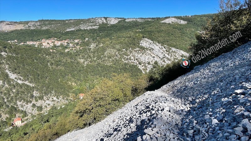 Der Aufstieg auf der gegenüber liegenden Seite nach Slowenien führt über ein gigantisches Geröllfeld und bringt mich nach etwa 400 hm wieder zu der Markierung des Alpe-Adria-Weges, die ich schon im Tal des Torrente Rosandra gesehen habe.