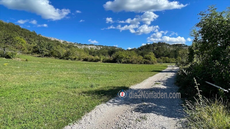 Für mich führt der weitere Wanderweg entlang der Grenze zu Italien auf Kastelec zu. Ich überquere die Autobahn A1 (völlig ungefährlich, da Tunnel 🤪) und nehme ab hier die Schotterstraßen, die sich langsam aber sicher ins Tal schlängeln, nach Podpec.