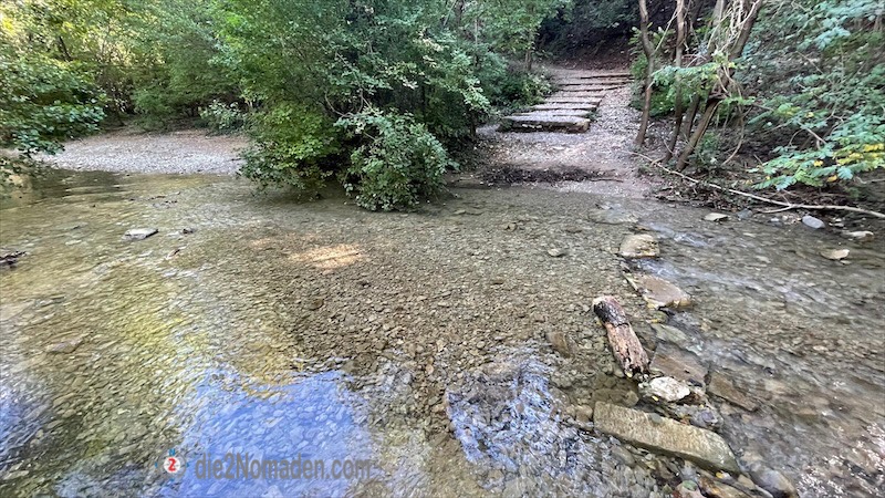 In der Talsohle angekommen, suche ich nach einem Übergang über den Bach Torrente Rosandra, finde eine seichte Stelle mit Steinen und quere den Bach ohne nass zu werden. 🤪