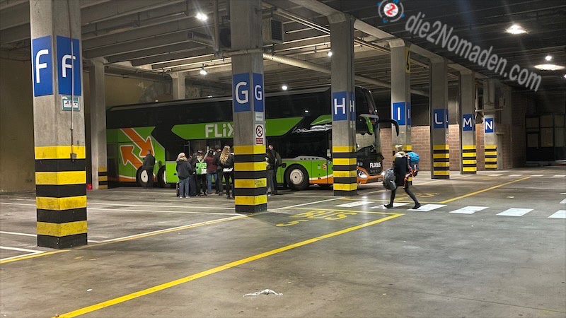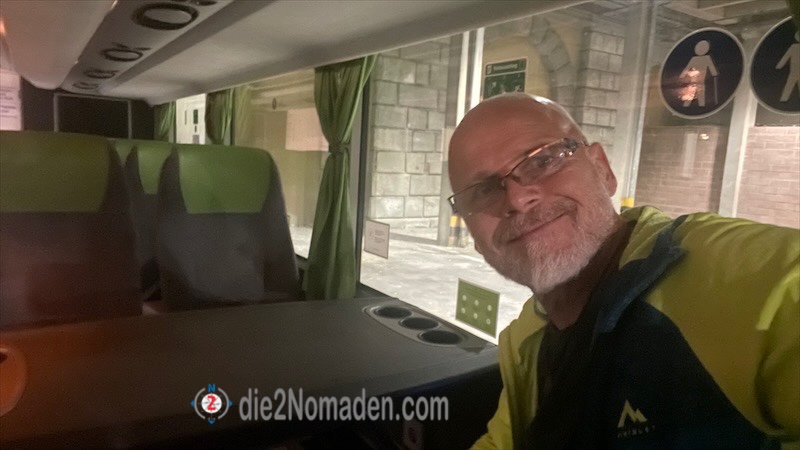Etwas früher als geplant trifft der Flixbus ein, die Formalitäten gehen zügig über die Bühne, ich stelle den Rucksack selbständig in die Garage und kann schon einsteigen.