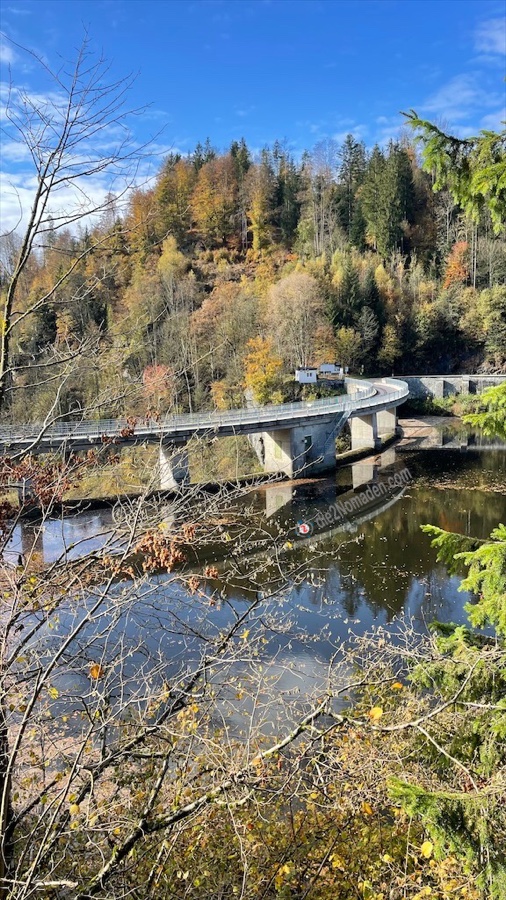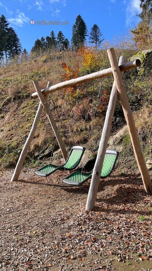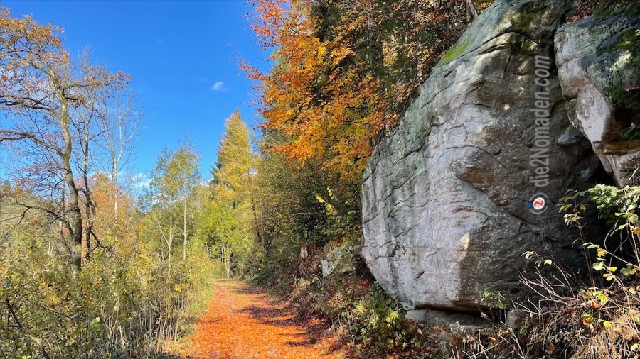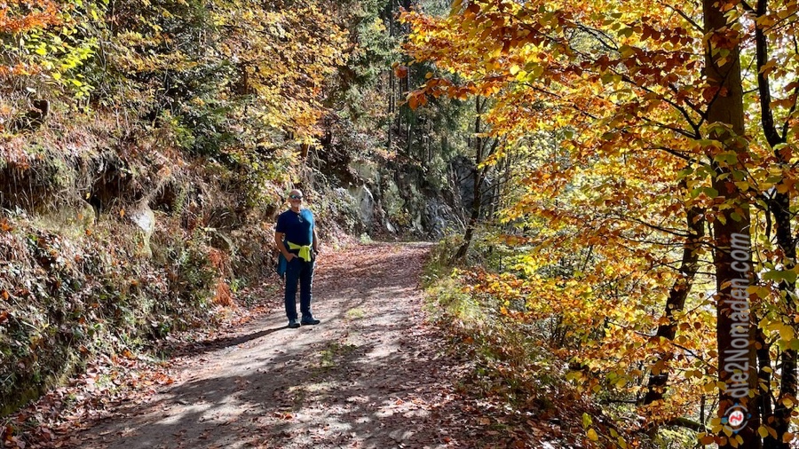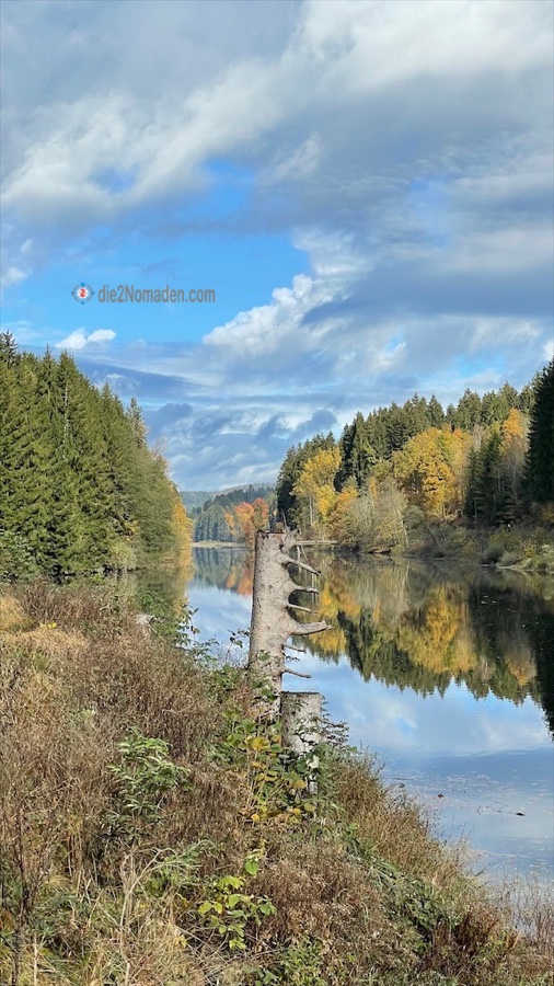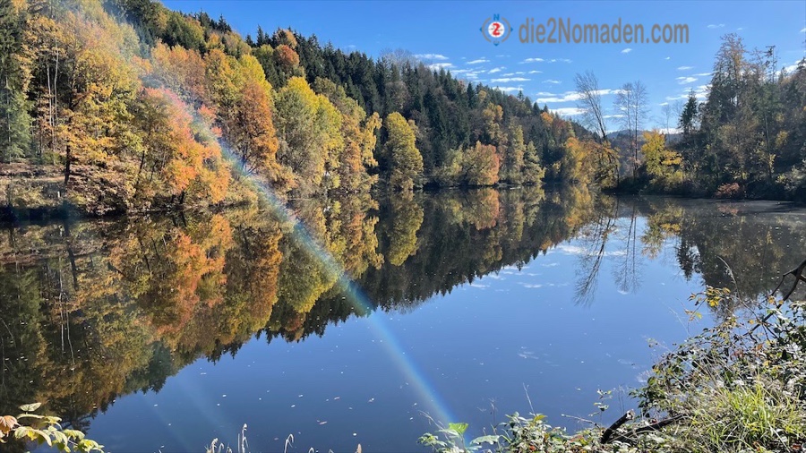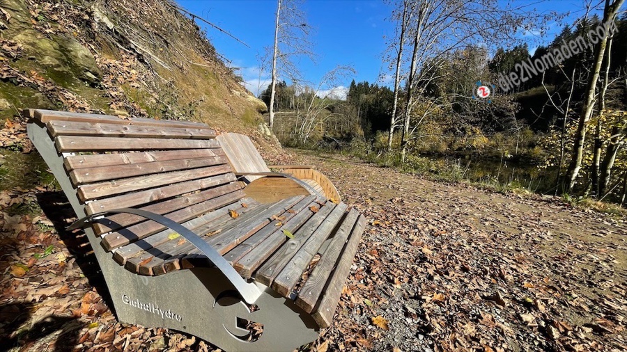 Viele Fotos später erreichen wir die Staumauer – die Rannatalsperre. Und nach ein paar kurzen Blicken hinunter geht es die Straße hinauf zum nächsten Einstieg wieder auf den Forstweg. Auch hier genießen wir den bunten Herbstwald und aufgrund der wärmenden Sonnenstrahlen brauchen wir nicht einmal unsere Jacken und wandern kurzärmelig. Andre versucht sich auf einem Geschicklichkeitsgerät, die es auch auf dieser Seite des Sees gibt, genauso wie die Sonnenliegen.