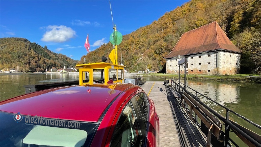 Nun gut, so fahren wir mit der Fähre hinüber an das andere Ufer. Der nette Fähr-Kapitän ruft in zwei ihm bekannten Gasthäusern an – ebenso umsonst, weil zu. Der einzige Trost ist die traumhaft schöne Fahrt durch den bunten Märchenwald und der Blick auf die Donau unter uns und schließlich geben wir auf. „Fahr nicht fort, iss im Ort“ trifft es in diesem Fall wirklich und so wird’s halt kein Wild, sondern eine Pizza daheim.