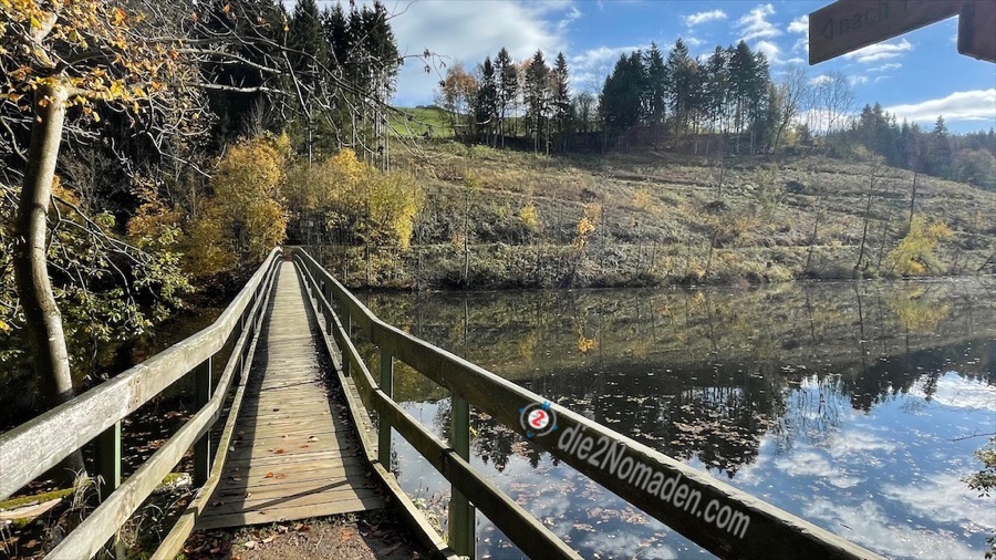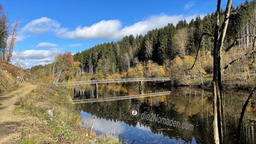 Der See bot herrliche Spiegelbilder und bald erreichten wir die Brücke in der Mitte des Stausees, die es uns ermöglichte, auf die andere Seite des Sees zu wechseln – den Konzinger Steg. Hier ist der Weg ein sehr schöner Forstweg mit allerlei kurzweiligen Stationen, die im Sommer Ruhesuchenden oder sonst sportbegeisterten Kindern und Erwachsenen Abwechslung bietet. Von Hängeschaukeln, über Hängematten und Fitnessparcours und einigen Kneippstationen für Jung und Alt wird hier alles geboten, was das Herz begehrt.