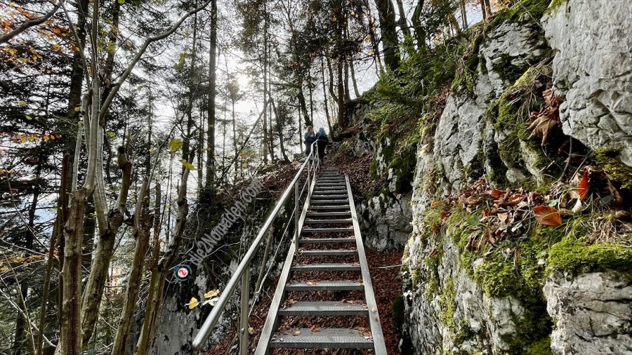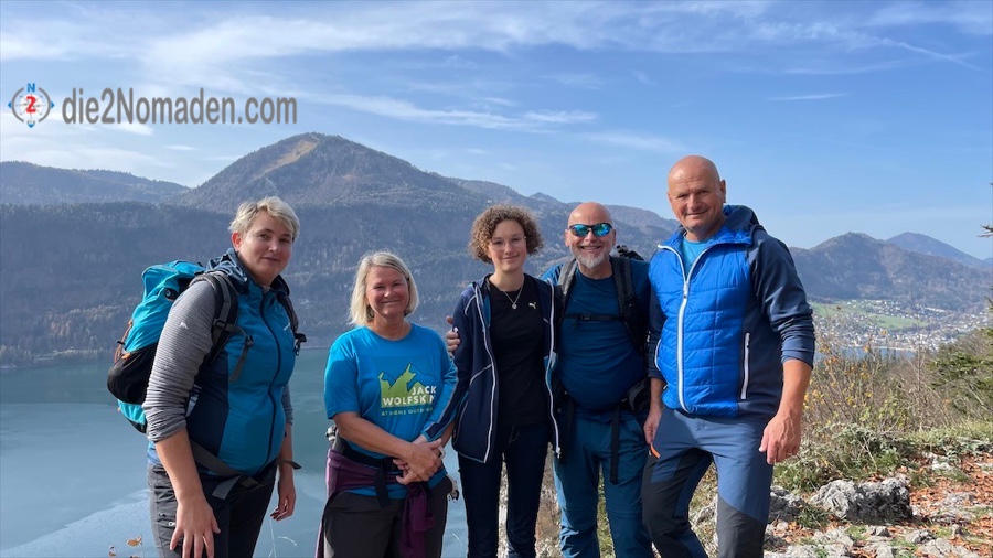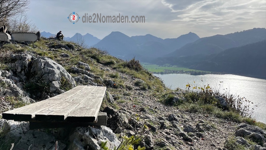 Wieder geht es bergauf, erst ein paar Treppen und dann ein Stück über einen felsigen Weg bis wir schließlich oben ankommen und den Ausblick, den man von hier hat, bestaunen. Hoch über dem Wolfgangsee und hinüber zum Sparber, zur Bleckwand, zum Zwölferhorn und Rinnkogel reicht unser Blick.
