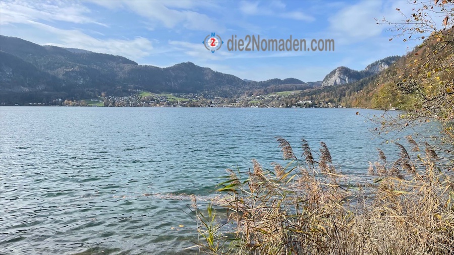 Auch hier geht es direkt am Ufer des Sees entlang, der See glitzert in der Sonne und das bunte Laub an den Bäumen beziehungsweise schon am Weg bieten ein herrliches Bild. Alle paar Meter sind Ruhebankerl mit Seeblick aufgestellt, die auch allerlei Informatives bieten, zum Beispiel wie der Abersee zum Wolfgangsee wurde.
