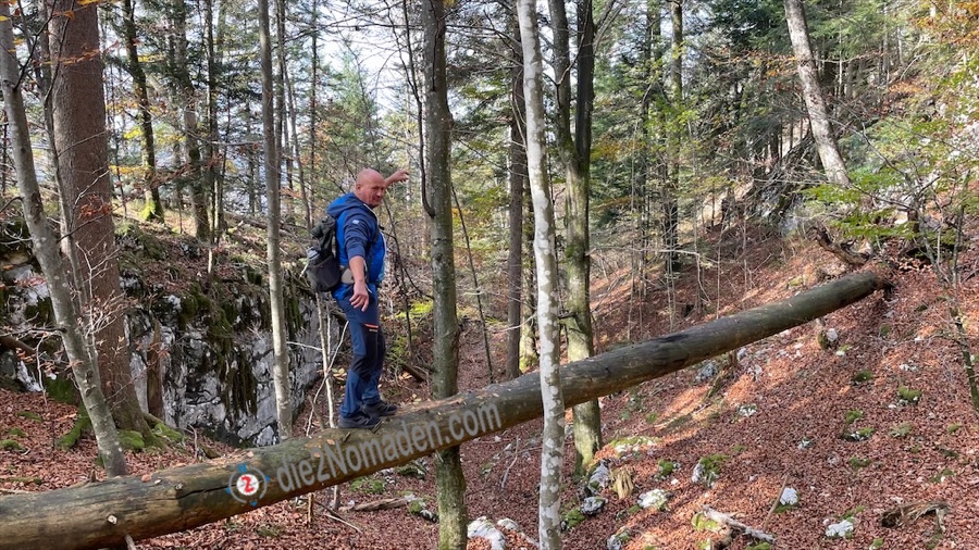 Wir verlassen den See und es geht relativ hurtig bergan durch den bunten Laubwald auf den Falkenstein. Meinereiner greift schon bald zum „Tschurifetzn“, der bei Wanderungen immer dabei sein muss, weil ich ansonsten waagrecht schwitze. Doch schließlich erklimme auch ich den Falkenstein und wir überlegen, welchen Weg wir nun nehmen.