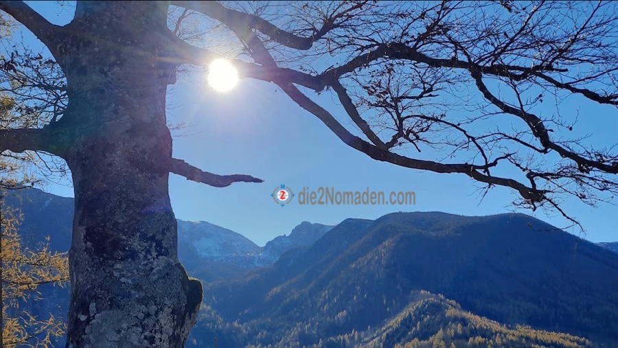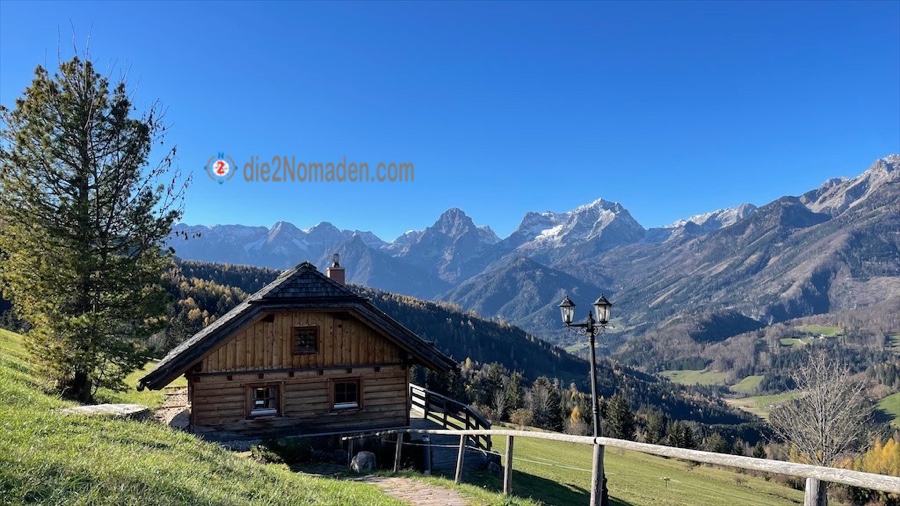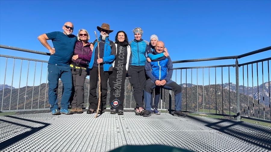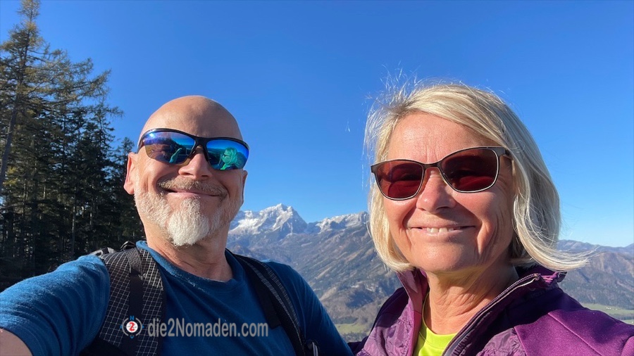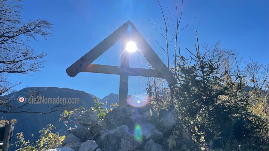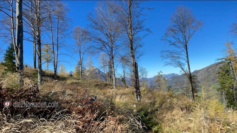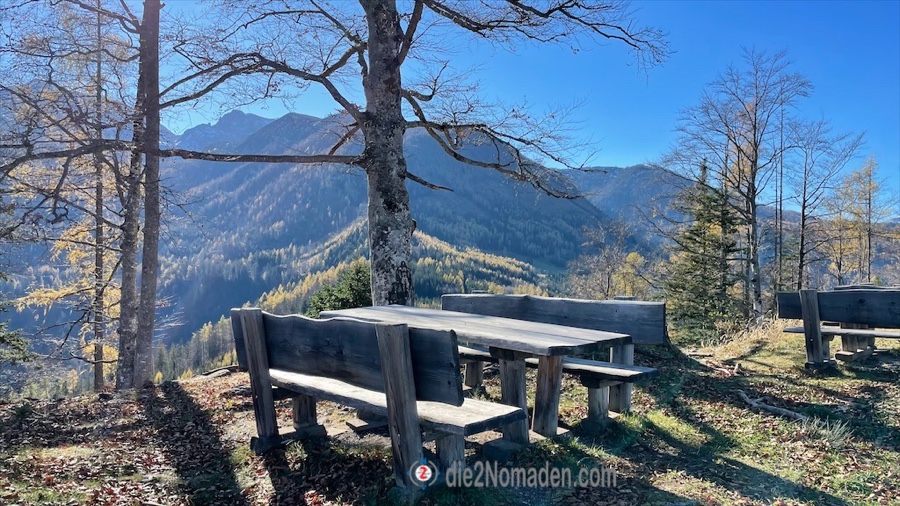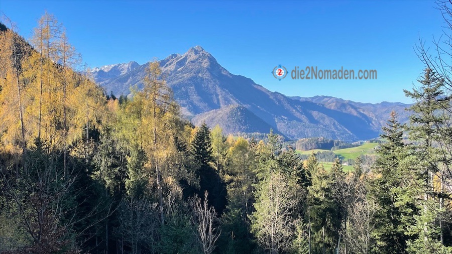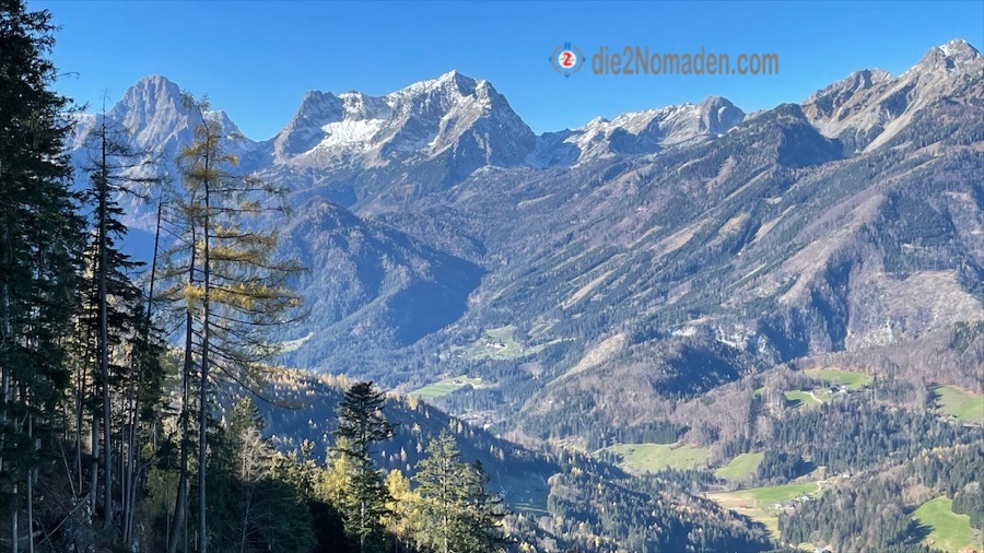 Wie einer der Five Fingers oder die Aussichtsplattform in Hallstatt reicht hier eine solche, kleinere Plattform hinaus über dem Tal und wir haben einen unglaublichen Blick auf die umliegende Bergwelt. Auf manchen Gipfeln liegt schon Schnee, über uns der blitzblaue Himmel und unter uns die Bäume im herbstlichen Kleid. Da nur wir auf der Plattform sind, genießen wir dort eine kleine Stärkung, bevor es wieder bergauf geht zur nächsten Aussicht und zum kleinen Gipfelkreuz des Hutbergs.