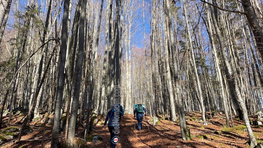 Schließlich kommen wir auf eine Lichtung, wo wir ein Stück vom ursprünglichen Weg abweichen und hinunter zur heutigen Attraktion absteigen – dem Stoderer Weitblick.