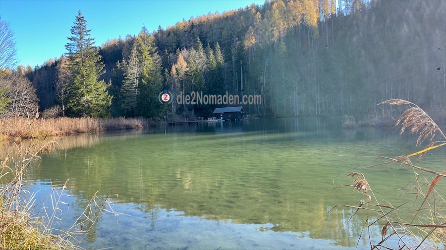 Fast hätten wir ihn übersehen, diesen kleinen süßen Teich inmitten von Bäumen und hohem Schilf. Ein paar Fotos später geht es wieder weiter hinauf, dezent – aber doch – in einigen Kehren, bis wir schließlich in den lichten Wald eintauchen. Die Bäume sind schon fast kahl, dafür leuchtet der Waldboden mit dem Laub in der Sonne rot.