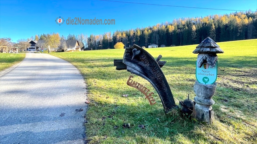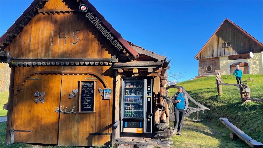 Wir starten um 9 Uhr und treffen uns genau eine Stunde später am Parkplatz beim Schafferteich in Vorderstoder. Dieser Parkplatz hat es gleich einmal in sich. Doch zuerst das Geschäftliche – wir zahlen am Automaten 3 Euro für 6 Stunden und bewundern dann die wunderschöne geschnitzte Hütte mit dem Selbstbedienungsautomaten. Also sollte jemand durstig von der Wanderung zurückkommen … hier gibt es alles, was das Herz begehrt. 😎
