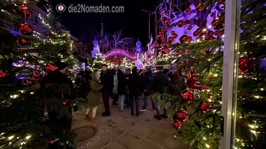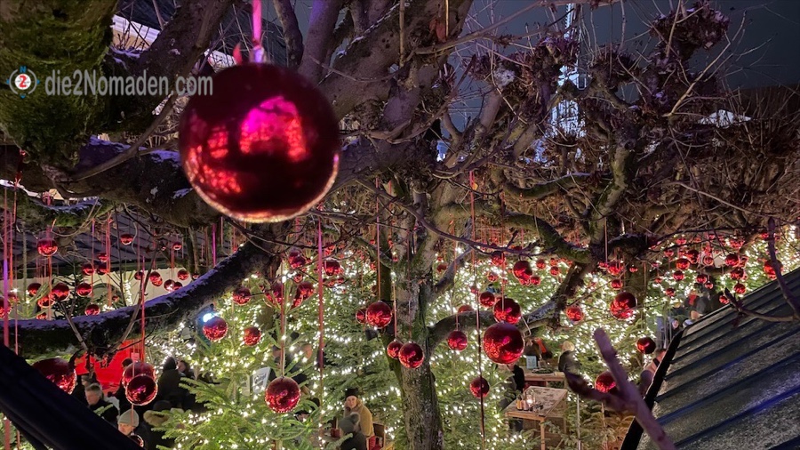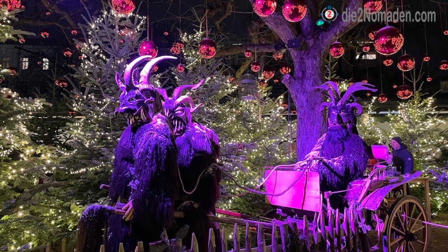 Der Adventmarkt im Klosterhof ist ja nun kein richtiger Adventmarkt, das heißt, es wird nur Essen und Trinken geboten, aber keine Verkaufsstände. Dafür lässt er die Weihnachts-Herzen wahrlich hüpfen und schon beim Eintreten in den eigentlichen Gastgarten, der zum Adventmarkt umfunktioniert wurde, bleibt einem der Mund offen stehen und sollte man bis zu diesem Zeitpunkt noch nicht in Weihnachtsstimmung sein – hier fährt sie direkt ein bis in die Zehenspitzen. Man wird augenblicklich zum Kind und ist sprachlos. Dass sich das schon herumgesprochen hat, merkt man schnell, denn auch hier wird man teilweise durchgeschoben. Aber das macht fast nichts, denn über einem baumeln 3.500 große, rote Kugeln (haben wir gehört), verteilt über den Garten sind sicher 200 Christbäume aufgestellt und dazwischen sind in kleinen Nischen nette Stehtischchen mit Laternen und Bänkchen aufgestellt, die mit Fellen bedeckt zum Verweilen einladen. Sogar Wärmeflaschen kann man mieten. Der Nikolaus und einige Perchten (ausgestopft) sind auch vertreten und es wird Livemusik geboten. Zudem fängt es genau hier an leicht zu schneien und mit einem Glas Punsch (ja, schon wieder) in der Hand, sind wir alle einer Meinung: Hier hat sich jemand selbst übertroffen mit dieser genialen Idee eines wunderschönen, weihnachtlichen Gartens.