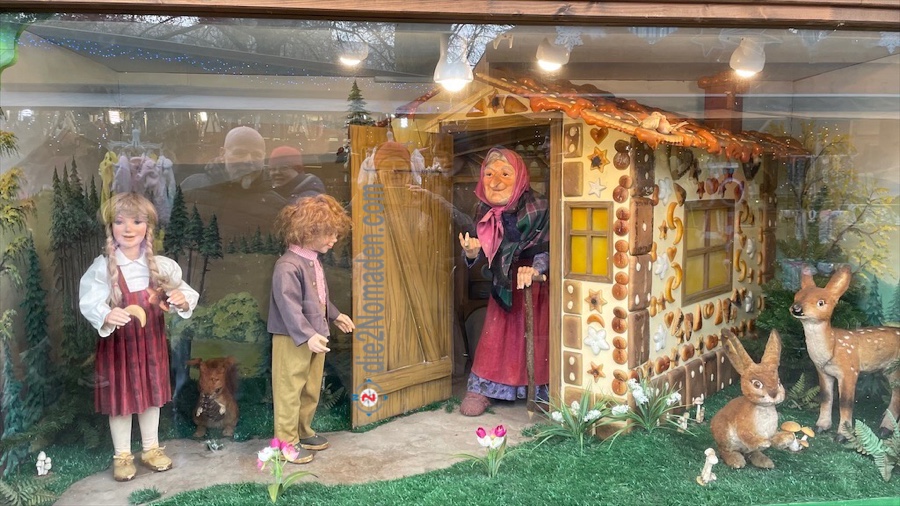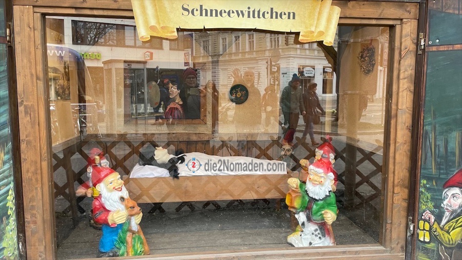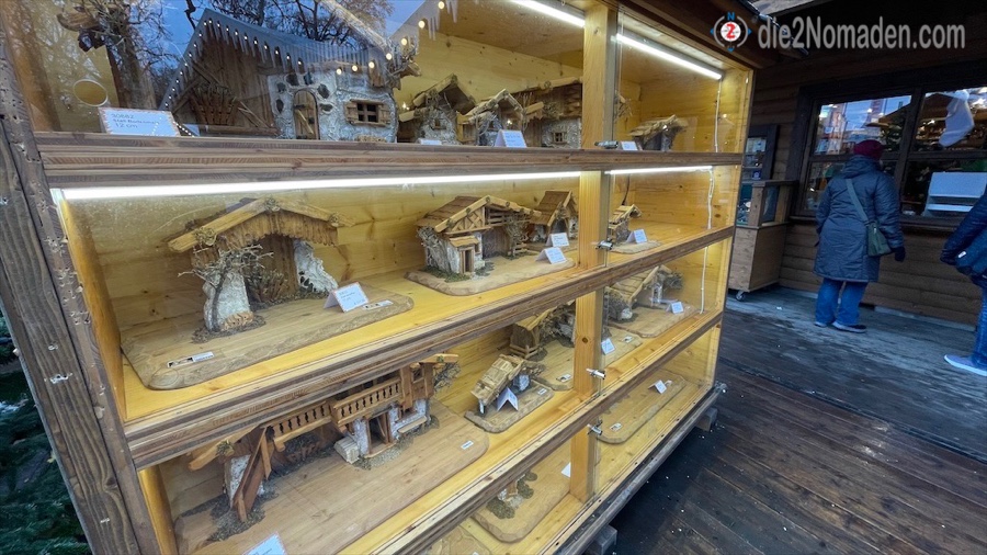 Der Adventmarkt am Volksgarten: Wenn man kleine Kinder hat, ist er empfehlenswert, weil zu den ausgestellten Märchenfiguren auch etwas Tingeltangel geboten wird und das die Kleinen sicher freut. Da wir aber keine Kinder dabei haben, auch keine langen Unterhosen, Socken oder Zuckerwatte brauchen, sehen wir uns in der Hütte mit den schönen Krippen und dazugehörigen Figuren um und gehen dann die Landstraße entlang hinein in die Stadt.