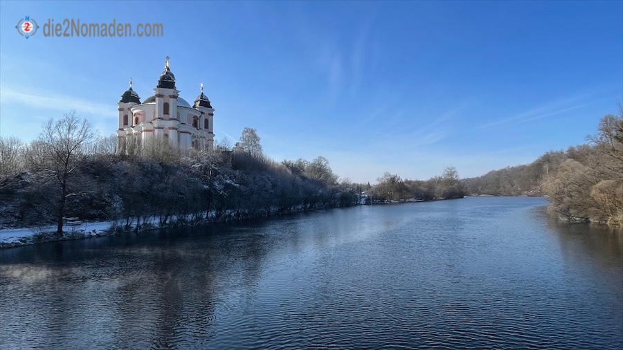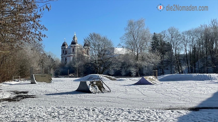 Bei km 13 sehe ich das erste Mal die Wallfahrtskirche zur Allerheiligsten Dreifaltigkeit von Stadl-Paura. Imposant steht die Kirche auf dem Paurahügel – wie ein Postkartenmotiv, so schön steht die Kirche hier in dieser Winterlandschaft. Hierbei handelt es sich auch um einen jahrtausende alten Siedlungsort mit kunsthistorischen Funden.