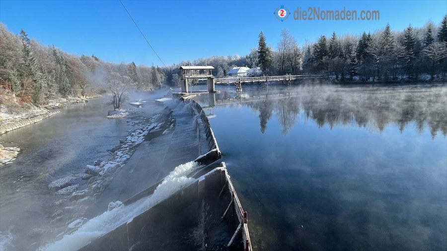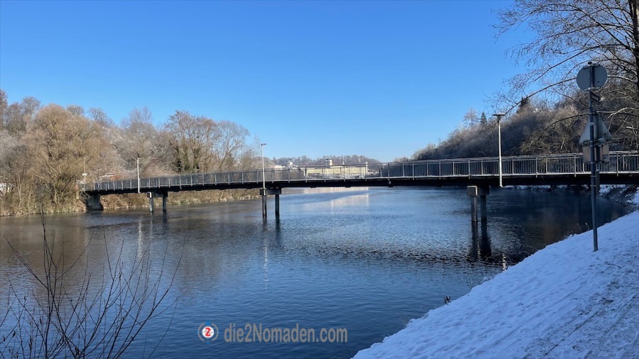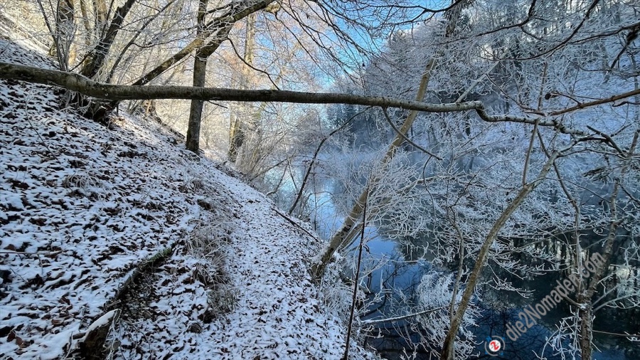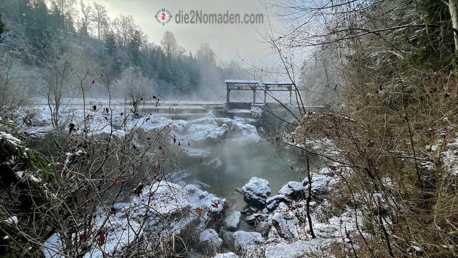 Nach etwa 2,5 km geht es auf schmalen Wanderwegen direkt entlang der Traun. Immer wieder muss ich aufpassen, dass ich auf dem verschneiten Waldboden nicht ausrutsche und direkt in der Traun lande.