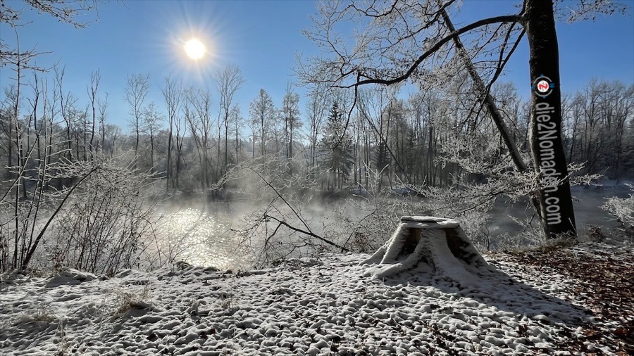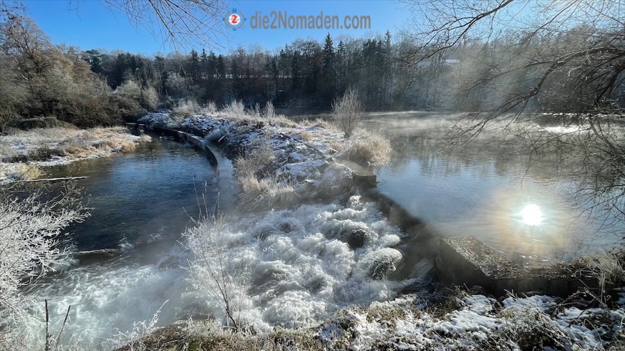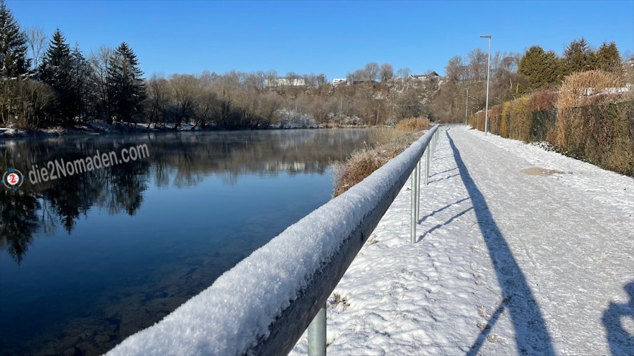Da die Sonne den Boden des Traunfalls noch nicht erreicht, wird es langsam ziemlich kalt und ich mache mich auf den Weg entlang der Traun. Es geht über verschneite und gefrorene Feldwege und durch wunderschöne Winterlandschaften.