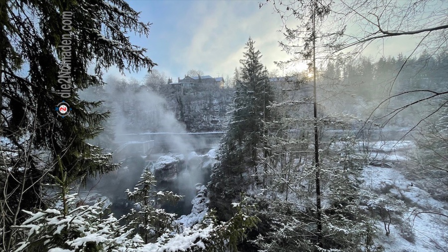 Gleich nach der Brücke muss ich runter, in den schattigen Traunfall. Durch die Vereisung und den zusätzlichen Sprühnebel des hinabstürzenden Wassers bietet sich ein wunderbares Schauspiel.