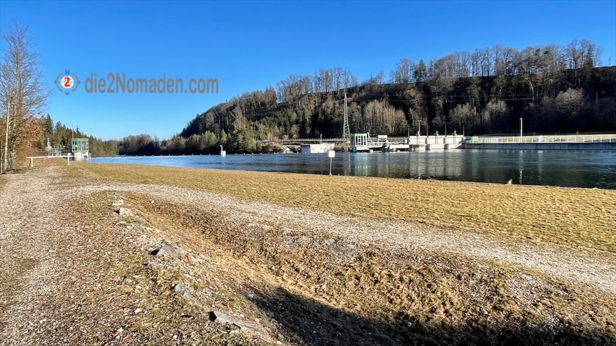 Rechtsseitig beginnt schon, in einem Seitenarm (Oberwasser) der Staubereich für das nächste, weiter unten gelegene Flusskraftwerk Traunleiten.