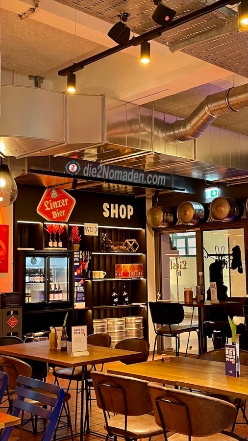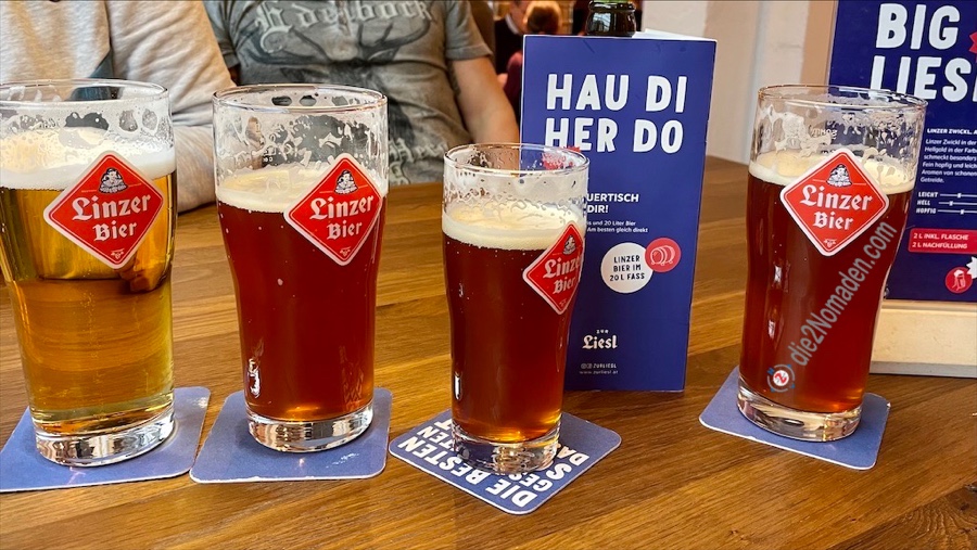 Da uns die Wanderung hungrig gemacht hat, statten wir dem Lokal in der Tabakfabrik „Zur Liesl“ einen Besuch ab. Das Ambiente des Lokals, das wir noch nicht kannten, gefällt uns, die Kellner sind freundlich und schon bald stehen drei kühle große und ein kleines Linzer Bier vor uns.
