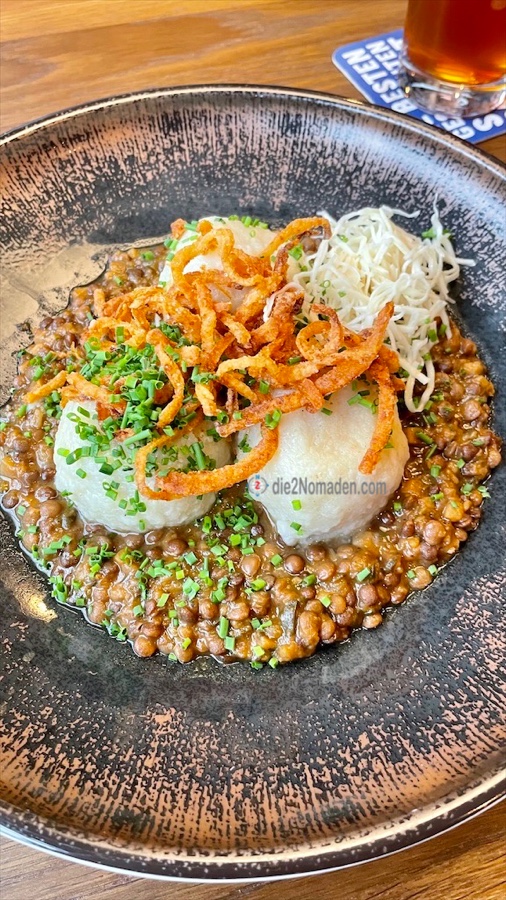 Erst einmal den Durst löschen und dann wird bestellt. Eine wirklich knusprige Stelze für zwei hungrige Männer ausreichend, dreierlei Knödel in Linsen (bissi scharf) und die allerletzte Portion Schweinsbraten.