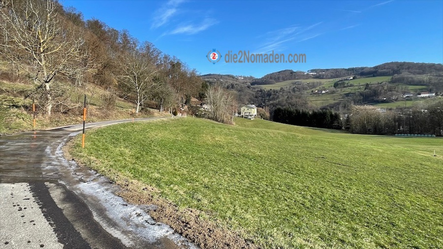 Ab hier wird der Schnee etwas mehr, aber auch alles im Rahmen und ohne alles gut zu gehen. Wir nehmen die Forststraße, die in die andere Richtung auf die Gis führen würde und folgen ihr in Richtung Linz. Vorbei geht es an wahrhaft tollen Häusern, noch tolleren Bauernhäusern auf sonnengefluteten Wiesen. Es riecht nach Frühling. Doch! Sowas kann man riechen, auch wenn Andre mich nicht ganz für voll nimmt.