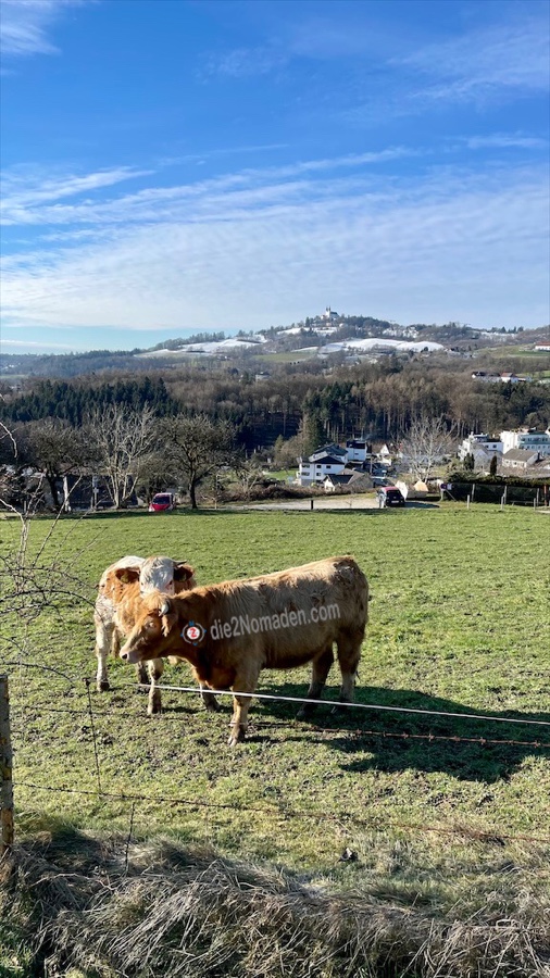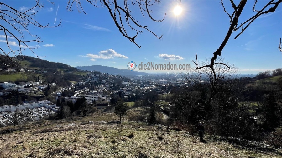 Raus aus den Turnschuhen und rein in die Wanderschuhe und schon geht’s los – erst eine Siedlungsstraße mit tollen Häusern hinauf, wo wir schon nach kurzem rechts auf den Wanderweg zum Gipfel des Gründbergs einschwenken. Hier treffen Gegensätze aufeinander – gerade noch im Nobelviertel von Linz und ein paar Meter weiter auf einer Kuhweide bzw. einem kleinen Weinberg mit einem grandiosen Ausblick über Linz, die Donau und bis hinüber zum Pöstlingberg. Wow – und bisher war es gar nicht mal anstrengend – noch.