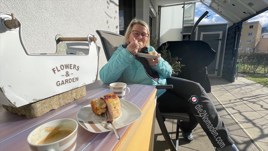 Die Stöcke zusammengefaltet, die Schuhe gewechselt und wir machen uns auf den Weg zur Konditorei Preining, um uns mit einem Stück Torte und einem Krapfen zu versorgen, die wir dann gemütlich in der Sonne zuhause auf der Terrasse genießen.
