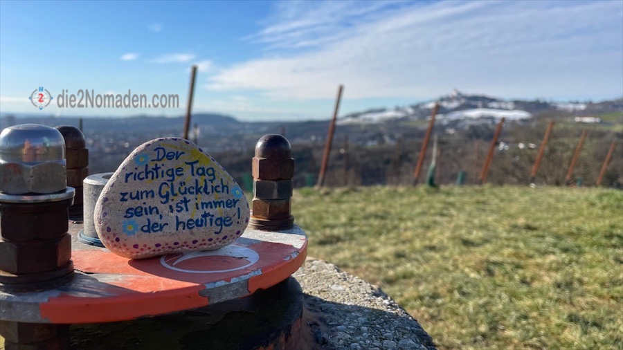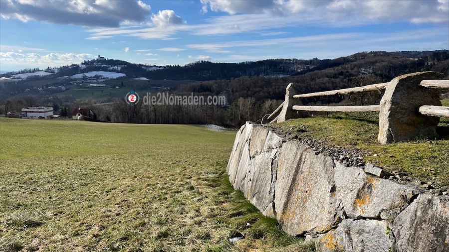 Einen Stein für die FB-Gruppe „Stoaroas“, den ich beim Sandner in St. Florian gefunden habe, ausgelegt und schon geht’s wieder den Hügel hinab, um dann nach einem kurzem Stück auf einer schmalen, manchmal eisigen, Asphaltstraße, vorbei an netten Schrebergarten-Häuschen wieder in einen Feldweg einzubiegen, um gleich bergan in den lichten Wald zu marschieren.