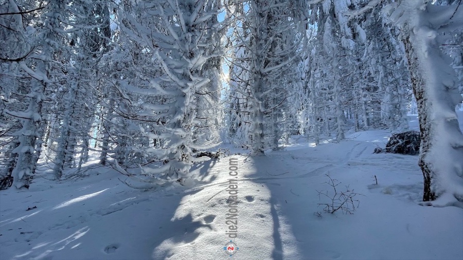 Gemütlich gleiten wir mit den Schneeschuhen dahin über den Schnee, unter blitzblauem Himmel und gleißendem Sonnenlicht und können unser Glück kaum fassen. Wir queren eine Straße und dann geht’s ein kurzes Stück auf einer Forststraße, bis wir wieder in einen Waldweg eintauchen. Unsere Begeisterung kennt keine Grenzen, je höher umso tiefer der Schnee, umso mehr sind die Bäume verschneit und umso strahlender leuchtet die Sonne am blauen Himmel.