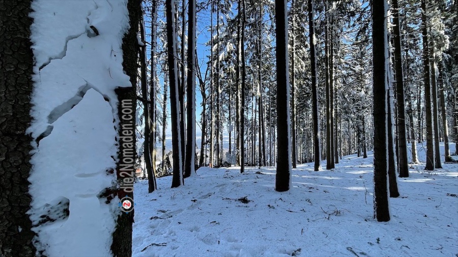 Wir genießen diesen Moment, machen noch die üblichen Gipfelkreuzfotos und dann geht’s bergab, erst durch den Wald bis zur Bergstation des Liftes und dann rechts davon im gleißenden Sonnenlicht hinunter Richtung Tal. Auf diesem Weg begegnen uns einige Tourenskigeher und Wanderer, hier sind wir nicht mehr alleine unterwegs. Der Wald zeigt sich auch hier in seinem schönsten Winterkleid und wir wandern fröhlich weiter, bis wir zur Waldschänke gelangen. Ein herrlicher Gastgarten in der Sonne würde sich hier anbieten zur Einkehr, doch leider ist am Mittwoch geschlossen. So setzen wir uns trotzdem in die Sonne, trinken unseren mitgebrachten Tee und essen unsere Müsliriegel.