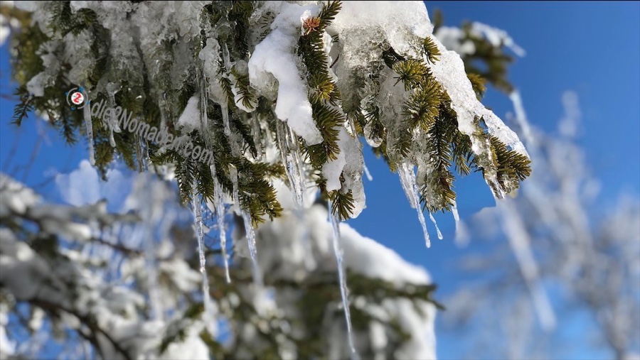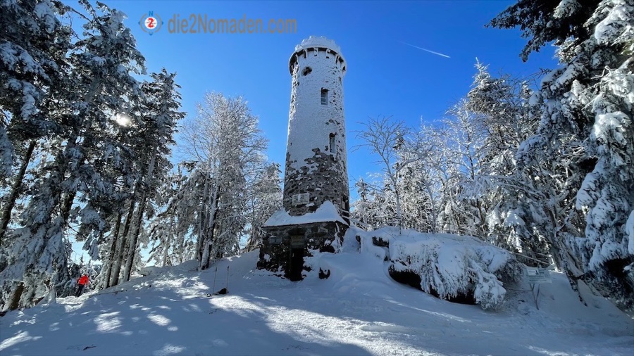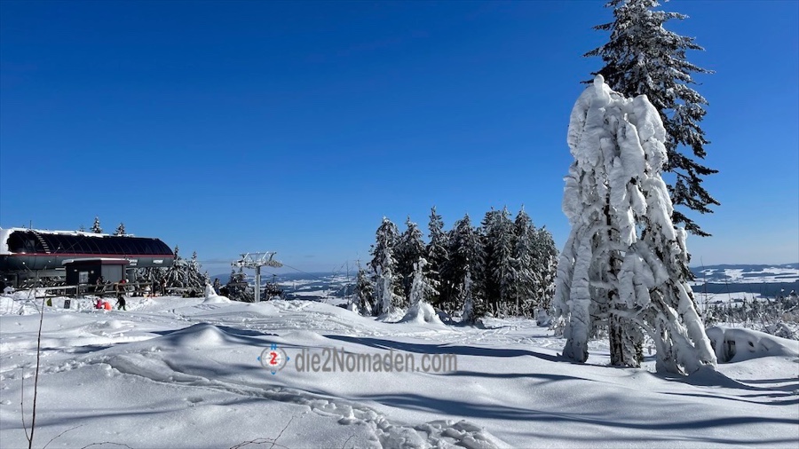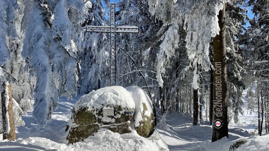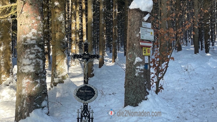 Und so stapfen wir bergan, es wird etwas steiler und wir erreichen den höchsten Punkt der Skipiste. Hier biegen wir rechts ab und nehmen ein Stück des Sterngartlweges. Die schmalen Bäume biegen sich hier unter der Last des Schnees und selbst die schmalsten Pflanzen und Bäumchen sind dick vom Schnee umhüllt. Uns ist jetzt schon klar, dass unsere Zeitnehmung völlig für den Hugo sein wird, weil niemand erahnen kann, wie viele Fotos wir geschossen und wie viele Videos wir gemacht haben. Egal – diesen Tag kann man nur genießen und so erreichen wir dann auch bald die Sternsteinwarte im Sonnenschein.