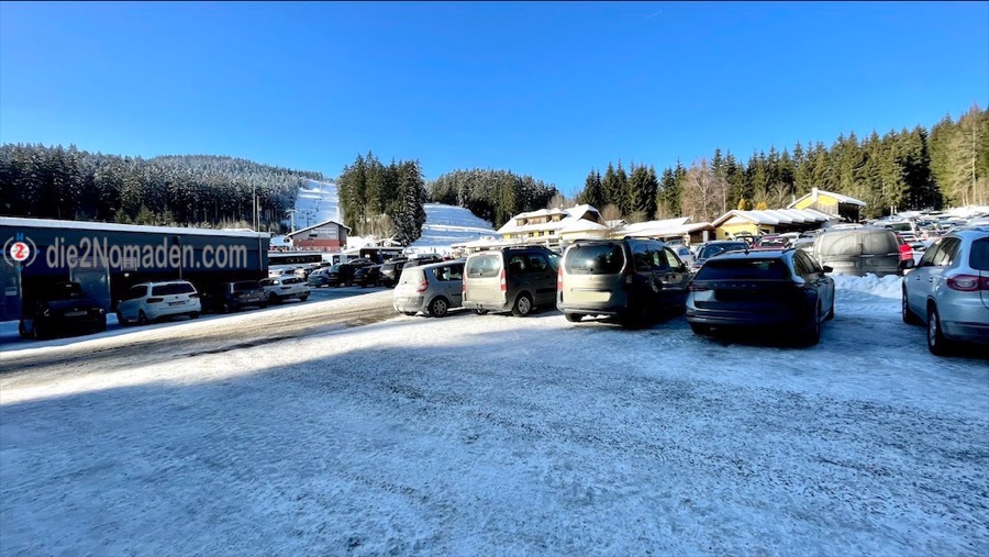 Erst in der Glasau lag etwas mehr Schnee, der allerdings Richtung Bad Leonfelden sogar etwas weniger wurde und wir schon unsere Hoffnung auf eine Schneeschuhtour schwinden sahen. An der Talstation des Liftes angekommen, war der Parkplatz schon gut belegt. Wir fanden aber noch ein Platzerl für unser Auto, packten uns warm ein und überlegten dann bezüglich Schneeschuhe mitnehmen oder nur Grödel. Schneemäßig sah es unten nicht großartig aus und die Straße durch den Wald hinauf war eisig. Alles klar, wir nehmen nur die Grödel mit.