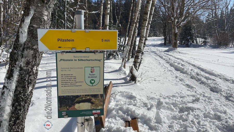 Nach circa 45 Minuten erreichen wir unser erstes Ziel – den Pilzstein. Erst ein paar tief verschneite Felsblöcke und dann steht er wirklich vor uns – ein riesiges Schwammerl aus grauer Vorzeit. Natürlich müssen Fotos geknipst werden und dann drehen wir um und gehen den kurzen Weg zurück, bis wir wieder auf unseren eigentlichen Weg treffen.