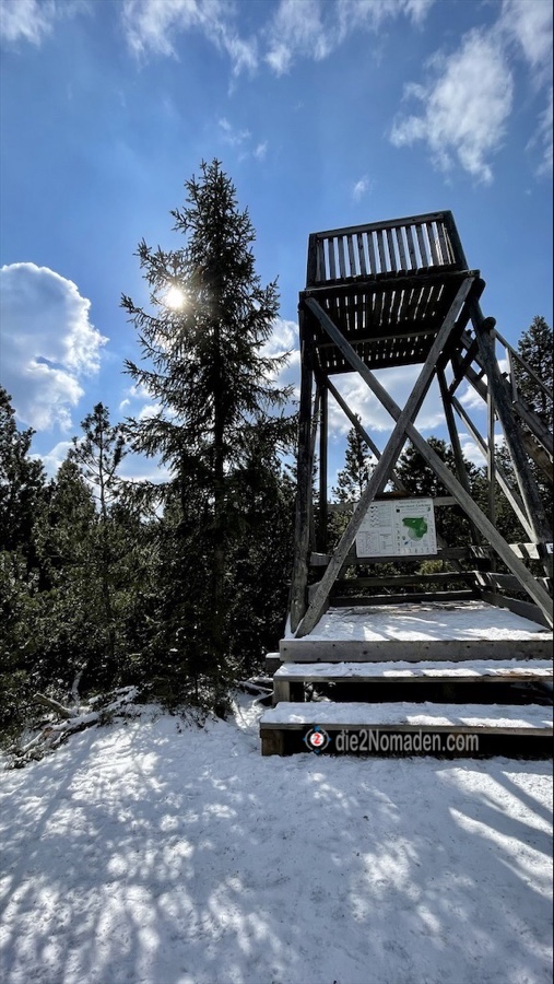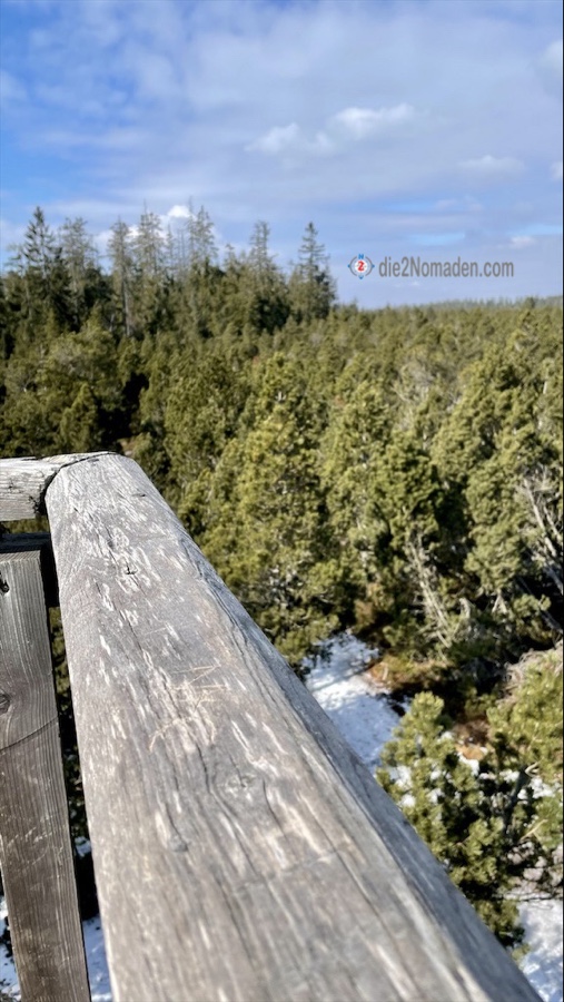 Der rund sechs Kilometer lange Moorwanderweg führt uns über Stege und Brücken zwischen Bäumen und den Latschen zu einem Hochstand. Hier heroben lässt sich das gesamte Moorgebiet überblicken.