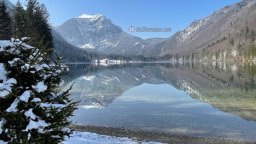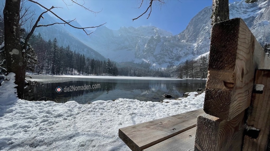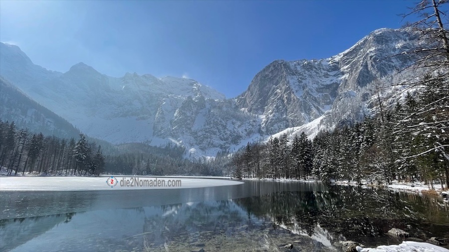 Nach einer guten 3/4 Stunde liegt nun der Hintere Langbathsee in voller Winterpracht vor uns. Die Bäume des Waldes sind noch tief verschneit, über uns der blitzblaue Himmel und der See trägt eine dicke Eisschicht – das tägliche Tauwasser vom Dach einer kleinen Hütte ist mit der Fallkette zu einem dicken Eisstrang gefroren, der in einem Holzfass zu stehen scheint.